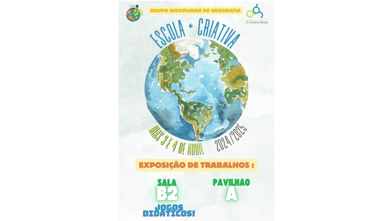 Exposição de Trabalhos – Escola Criativa, realizou-se nos dias 3 e 4 de abril, no Pavilhão A, Sala B2, sob a responsabilidade do grupo disciplinar de Geografia.